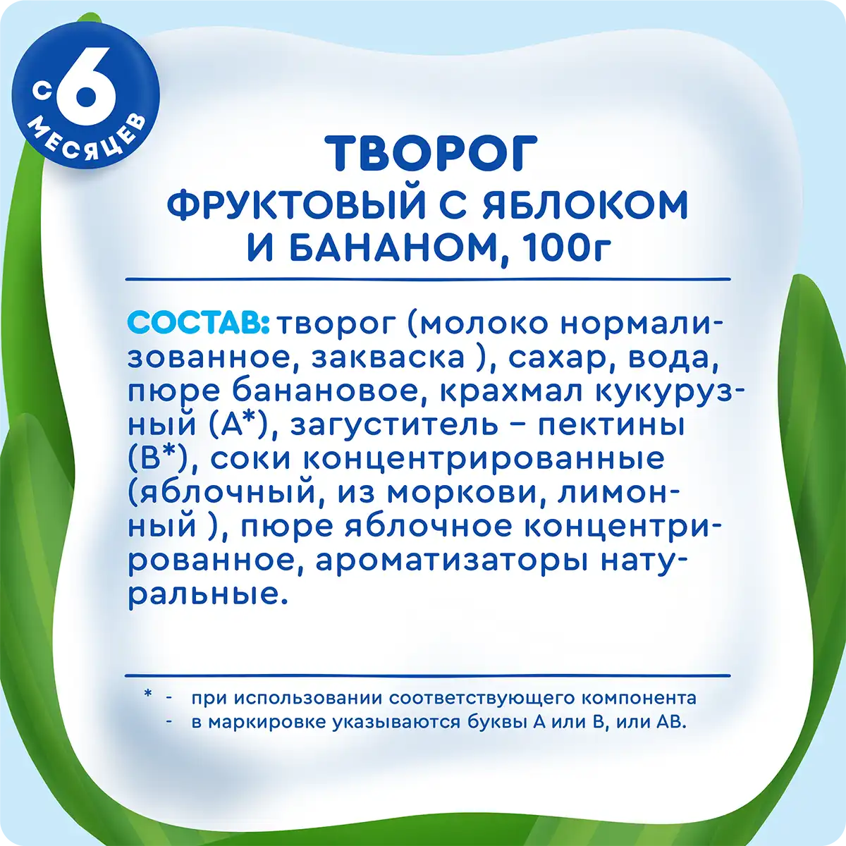 • Творог (молоко нормализованное , закваска ), сахар , вода, пюре банановое, крахмал кукурузный (А*) , загуститель – пектины (В*) , соки концентрированные (яблочный , из моркови , лимонный ), пюре яблочное концентрированное , ароматизаторы натуральные . * при использовании соответствующего компонента в маркировке указываются буквы А или В, или АВ.